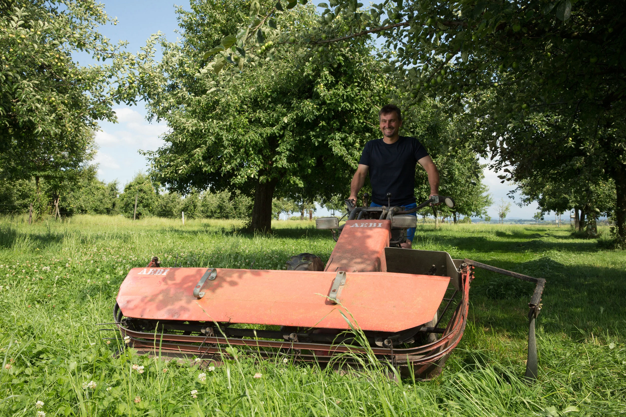 Landwirt zwischen seinen Obstbäumen im Mittelthurgau.